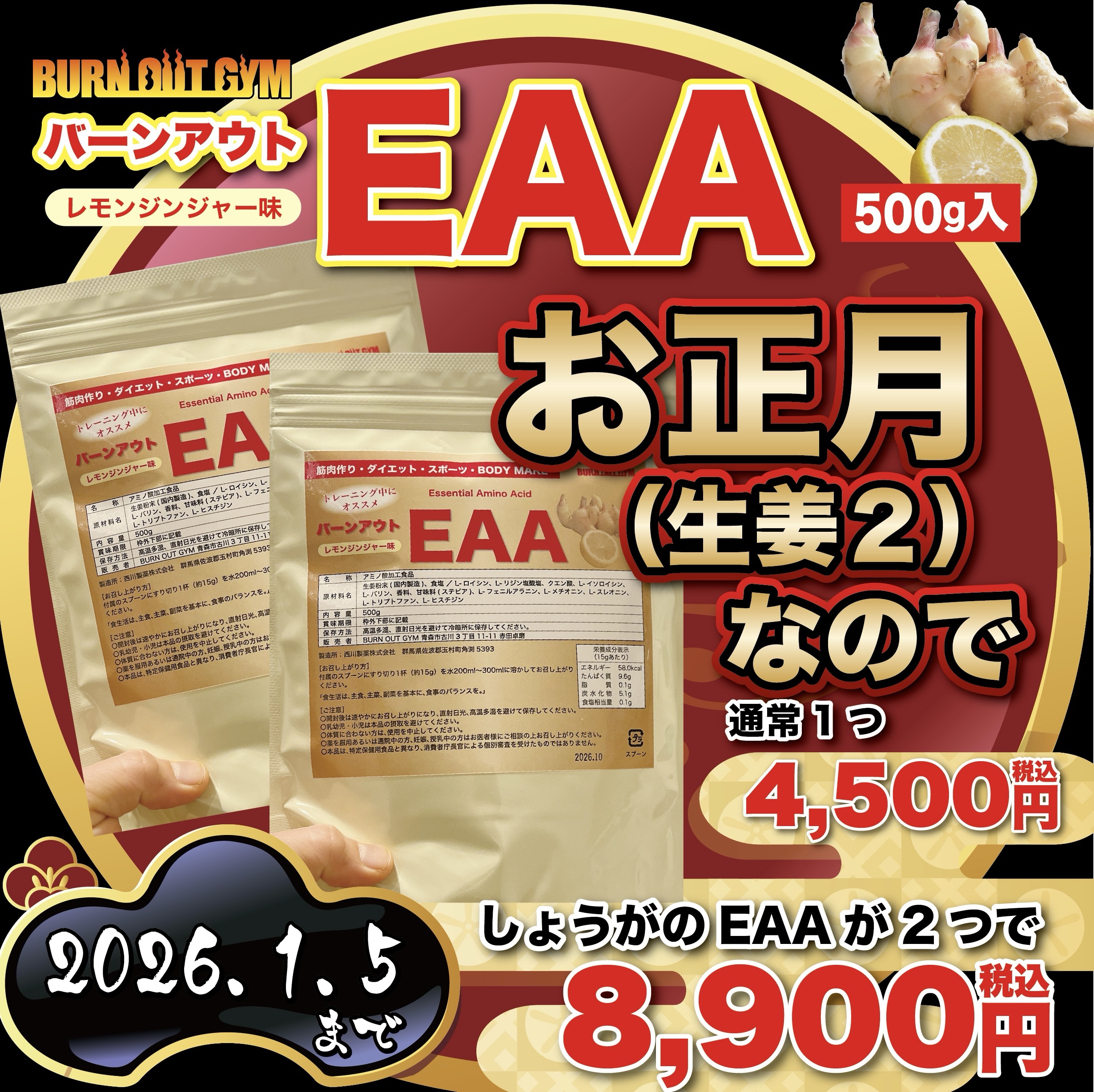 サプリメント お正月企画 2025年12月20日 当ジム制作のEAAのサプリメントをお正月特価で販売いたします。 EAAとは人間が必要としている必須アミノ酸を全種バランスよく配合したものです。 トレーニング中に飲むことで身体作りの補助となります。 生姜味ですので美味しく飲めます。 この機会にぜひ。 美味しいですよ。