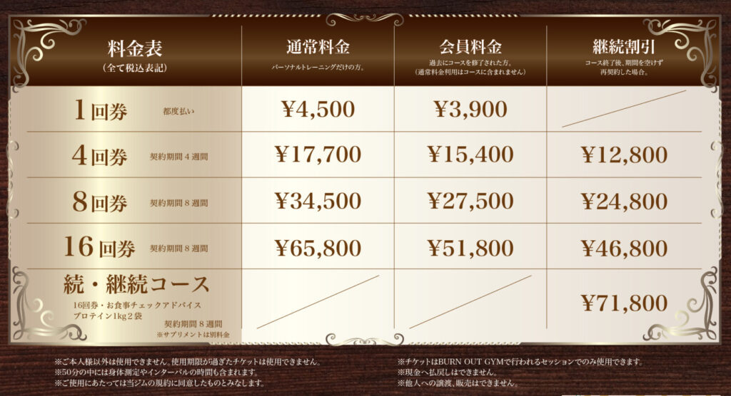 パーソナルトレーニング 50分×16回券(有効期限8週間) ¥51,800(税込)